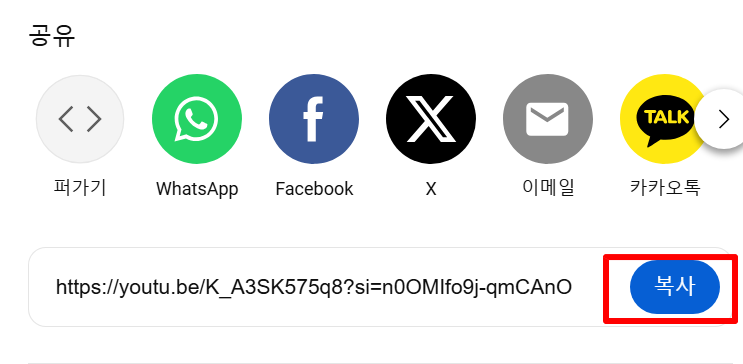 - 동영상 하단의 '공유' 버튼을 클릭한 후, '복사' 버튼을 눌러 링크를 복사합니다.