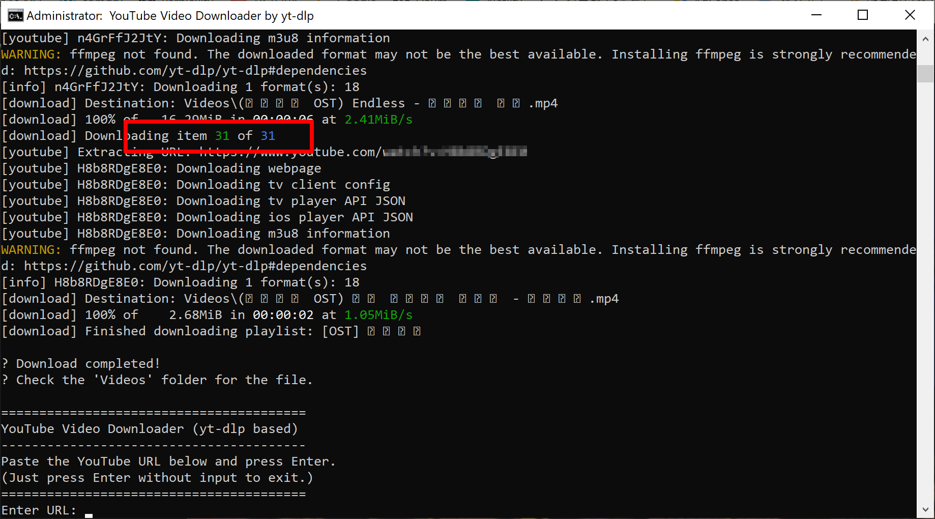 실제 프로그램은 동영상 주소를 입력하면 하나를 받을 수 있는데 배치파일로 수정하여 플레이리스트를 다 받을 수 있게끔 만들었습니다.
