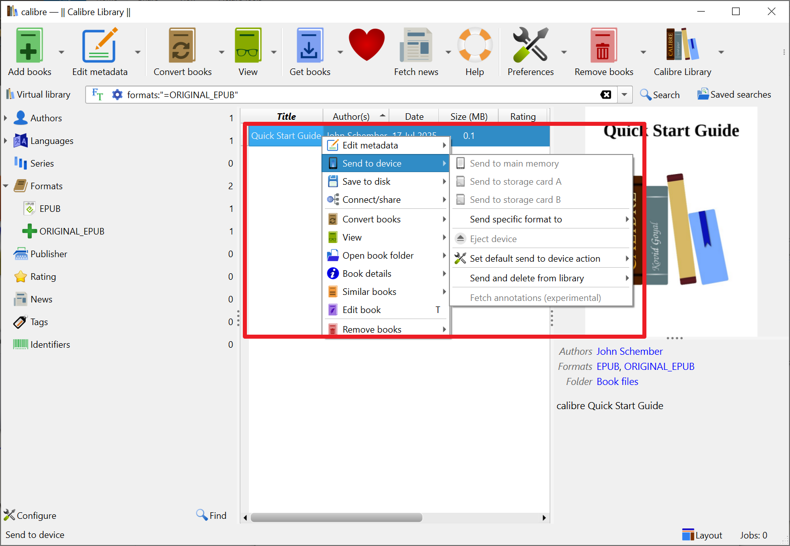 해당 전자책에 마우스 우클릭을 하여 send to device를 하면 연결된 전자책 기기에 변환한 파일을 보낼 수 있습니다.